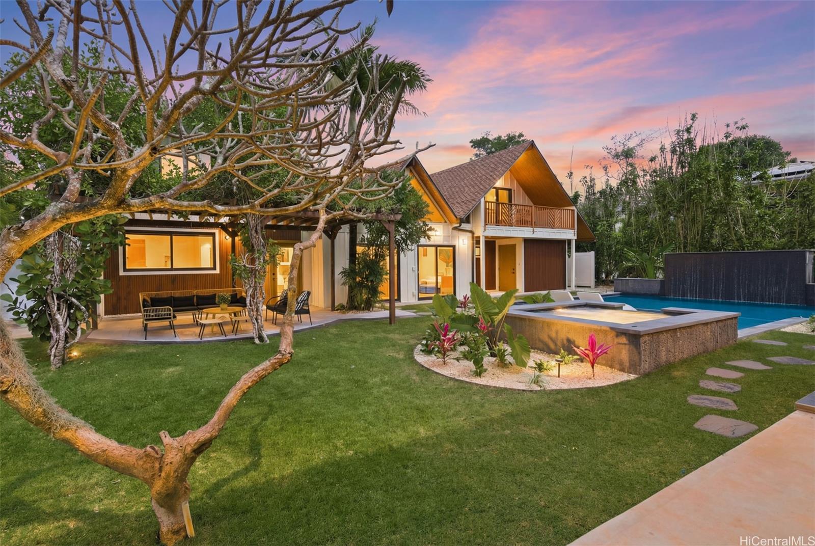Tucked away in the heart of Kailua, this beautifully remodeled luxury residence is a rare blend of striking architectural design & authentic Hawaiian charm. Thoughtfully crafted with rich lava rock accents & natural textures throughout, the home offers a warm, elevated island lifestyle that feels both refined & relaxed. The main residence features 5 spacious bedrooms & 4 bathrooms, showcasing beautiful finishes, open-concept living, & seamless indoor-outdoor flow. The chefs kitchen is a dream with a large butlers pantry. Step outside to your private oasis—an exceptional pool with a cascading waterfall & built-in jacuzzi surrounded with beautiful landscaping, creates a tranquil paradise perfect for unwinding or entertaining. The expansive covered outdoor area is designed for gathering, complete with space to barbecue, relax & even enjoy your own red light sauna. The property also includes an approved 1-bedroom, 1-bath ADU, ideal for multigenerational living, guest accommodations, or potential rental income. Whether you’re hosting unforgettable evenings under the stars or enjoying peaceful mornings surrounded by island beauty, this home captures the essence of luxury Hawaii living.