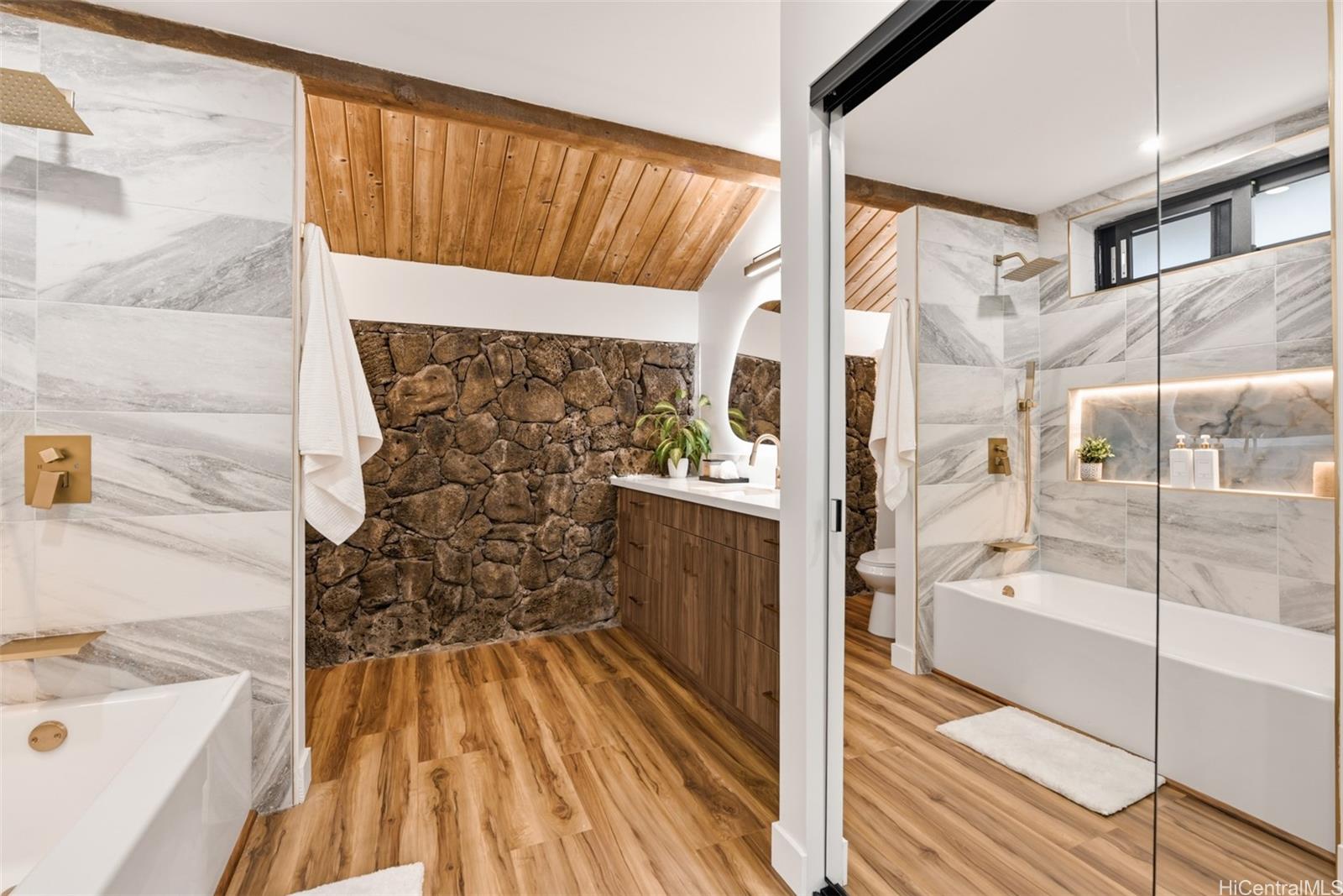 カイルアの中心部にひっそりと佇む、美しく改装されたこの高級邸宅は、印象的な建築デザインと本物のハワイアン・チャームが見事に融合した稀有な物件です。豊かな溶岩石のアクセントと自然素材を随所に用いて丁寧に造り上げられたこの家は、洗練されていながらもリラックスできる、温かく上質なアイランドライフスタイルを提供します。メインの邸宅には、広々とした5つのベッドルームと4つのバスルームがあり、美しい仕上げ、開放的なリビング、そして室内と屋外がシームレスにつながる空間が特徴です。シェフ仕様のキッチンには、広々としたパントリーが備え付けられています。外に出ると、プライベートなオアシスが広がります。滝が流れ落ちる特別なプールとビルトインのジャグジーが美しい景観に囲まれ、くつろいだり、ゲストをもてなしたりするのに最適な静かな楽園を作り出しています。広々とした屋根付きの屋外エリアは、バーベキューやリラックス、さらには専用のレッドライトサウナを楽しむスペースも完備し、集いの場として設計されています。敷地内には、認可済みの1ベッドルーム、1バスルームのADU(付属住宅ユニット)もあり、多世代同居、ゲスト用宿泊施設、または賃貸収入を得るのに最適です。星空の下で忘れられない夜を過ごしたり、島の美しい自然に囲まれた静かな朝を楽しんだり、この家はハワイの贅沢な暮らしの本質を捉えています。