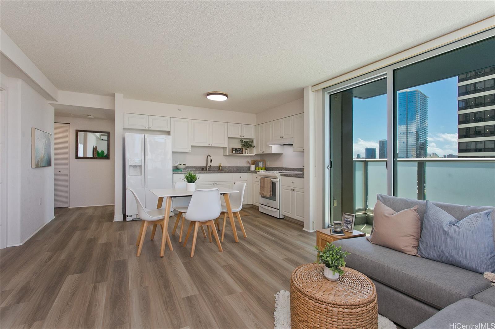 カカアコで驚くほどのお買い得物件!この「22」スタックユニットは、865平方フィートの室内と103平方フィートのラップアラウンドラナイを誇る、2ベッドルーム、2バスルームの間取りの中でも特に広いユニットです。床から天井までのガラスのスライドドアが、自然光、ちらりと見える海の景色、そして心地よい風を取り込む、見事な「ガラスのコーナー」を作り出しています。南東向きのこの人気のコーナーユニットは、建物の静かな側に位置し、キッチン/ダイニング/リビングエリアには新しいビニールプランクフローリング、ベッドルームには新しいカーペットが敷かれています。管理費は、865平方フィートのユニットで月額546ドルと、ホノルルでも最低水準です。2017年に建てられたこの新しい建物には、消火スプリンクラー、二重壁、各ベッドルームに複数のオーニング窓、全室にスプリットエアコン、そしてユニット内に洗濯乾燥機が備え付けられています。広々としたメインベッドルームには、シッティングエリアやデスクエリアを設けることができます。廊下にあるバスルームは広々としており、ADA(アメリカ障害者法)に準拠したバリアフリーの入り口、ウォークインシャワー、収納クローゼットを備えています。各タワーには、カフェスタイルのロビー、駐車場、豊富なゲスト用駐車場、24時間セキュリティ、広々としたレクリエーション/会議室、オンサイト管理(B棟)が完備されています。ユニットには、指定なしの駐車スペースが2台分付属します。ダウンタウン、SALT、ワードビレッジ、ストラウブ、クイーンズなどにも近く便利です。