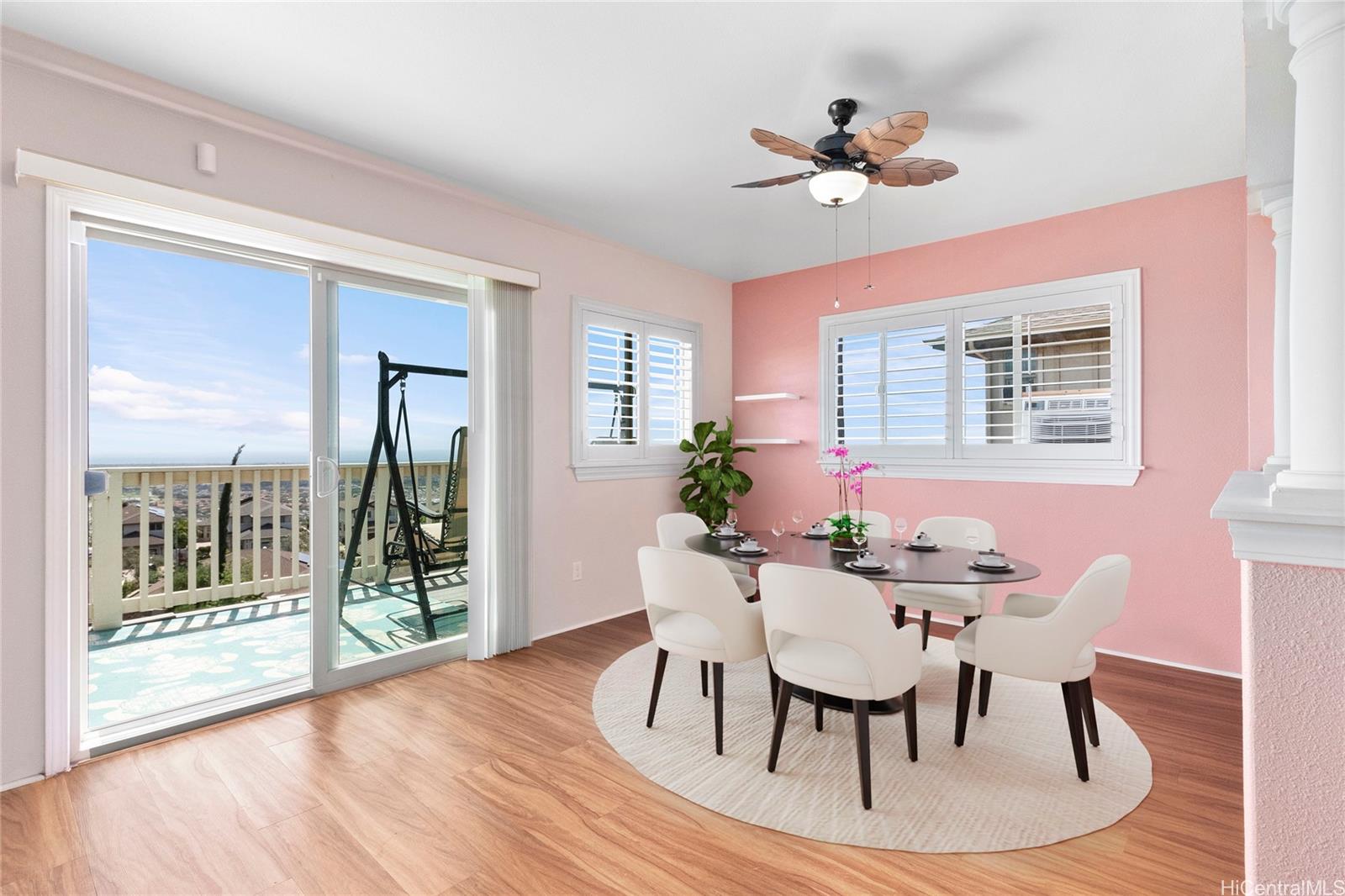 Welcome home to your amazing two story 3 bedroom 3 bath retreat in Makakilo-Kahiwelo. You'll love everything the home offers, from the stunning ocean, Diamond Head, and sunrise views, the open floor plan kitchen, dining & living room, the open lanai perfect for al fresco dining, spacious 2-car garage, and lush back yard with amazing views. The main floor includes a bedroom and full bath for ease and convenience. Other features include Central AC, ADT security system complete with CCTV cameras and smoke alarms, storage shed and fire pit. Don't miss out, schedule your private tour today!