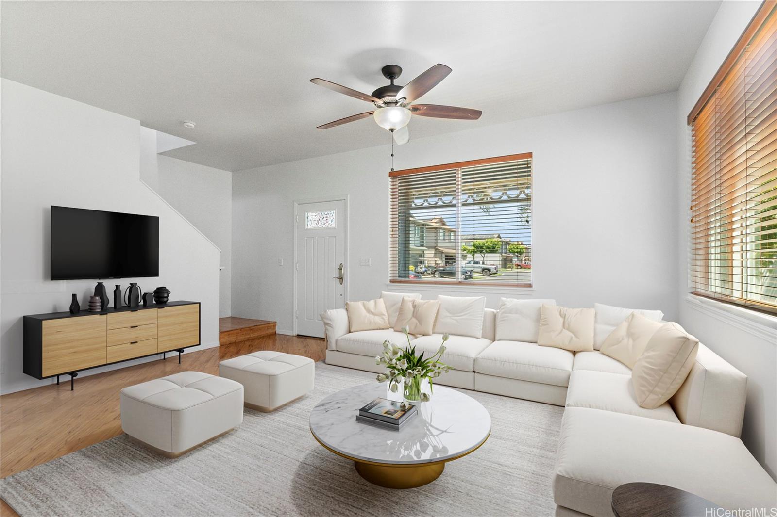 VA Assumable at 2.5% interest rate! $10K Seller Credit Offered! Well Maintained, 3x bedroom/2.5x bathroom Laulani Single Family Home with larger yard lot in a family friendly neighborhood. Within a short walking distance to Laulani Village Shopping Center (Shopping, Grocery Store, Restaurants, etc) and across from the Hawaii Prince Golf Course. Features include 2x additional parking stalls, 5x Owned PV Panels, and community recreation center (swimming pool, cabanas, green spaces, clubhouse, deck, etc). Water, Sewer, & Trash included. One or more photos