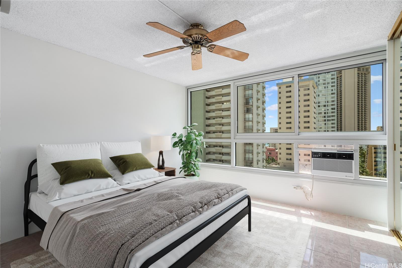Light, breeze, and captivating city views welcome you to this desirable corner unit at Waikiki Townhouse. This 1-bed, 1-bath residence offers a 547 sqft interior combined with a 135 sqft enclosed lanai for 682 sqft of total living space. Features: in-unit washer/dryer, window AC units, freshly repainted interiors, and a reglazed bathtub for a move-in ready feel. Assigned parking is available via building waitlist. Waikiki Townhouse is a pet-friendly and VA-approved building with great amenities and conveniences: resident manager, secured entry, sun deck, bicycle & surfboard storage. Waikiki living! Mere minutes from Kuhio and Kalakaua Avenues, world-class shopping, dining, and entertainment, and only a quarter-mile from the beach. This is a fantastic opportunity for a primary residence, second home, or investment property. Special assessment for windows was paid off and no sandwich lease! Photos have been enhanced/ virtually staged.