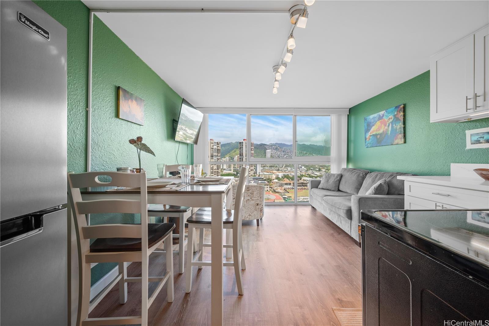 Nearly $100,000 in upgrades to this move-in ready unit! There are upgraded picturesque living room windows at a cost of $17,942.89 done in January 2021. This window system replaced the 49-year-old, single-paned window that most units still have. The new window system utilizes modern, dual-pane, low e, 1" insulated glass which is substantially quieter and reflects much more of the sun's heat (infrared radiation) and damaging rays (ultra violet radiation). The Class I clear anodized aluminum extrusions are also much thicker for increased wind load capacity meeting modern requirements. The bedroom window was also recently replaced with a double paned slider. Also in 2021, a full unit renovation was done, including removal of the popcorn ceiling, luxury vinyl plank flooring added, and interior painting. Kitchen design is unique, with the sink in the rounded corner, soft close cabinets and quartz counter tops. Shower has a cute sliding barn door. All furniture is included (purchased from Ashley Honolulu), including a sofa that can be converted into a queen size bed. For the past 5 yrs, this unit has been used as a second vacation home so it's hardly been used and in excellent condition.