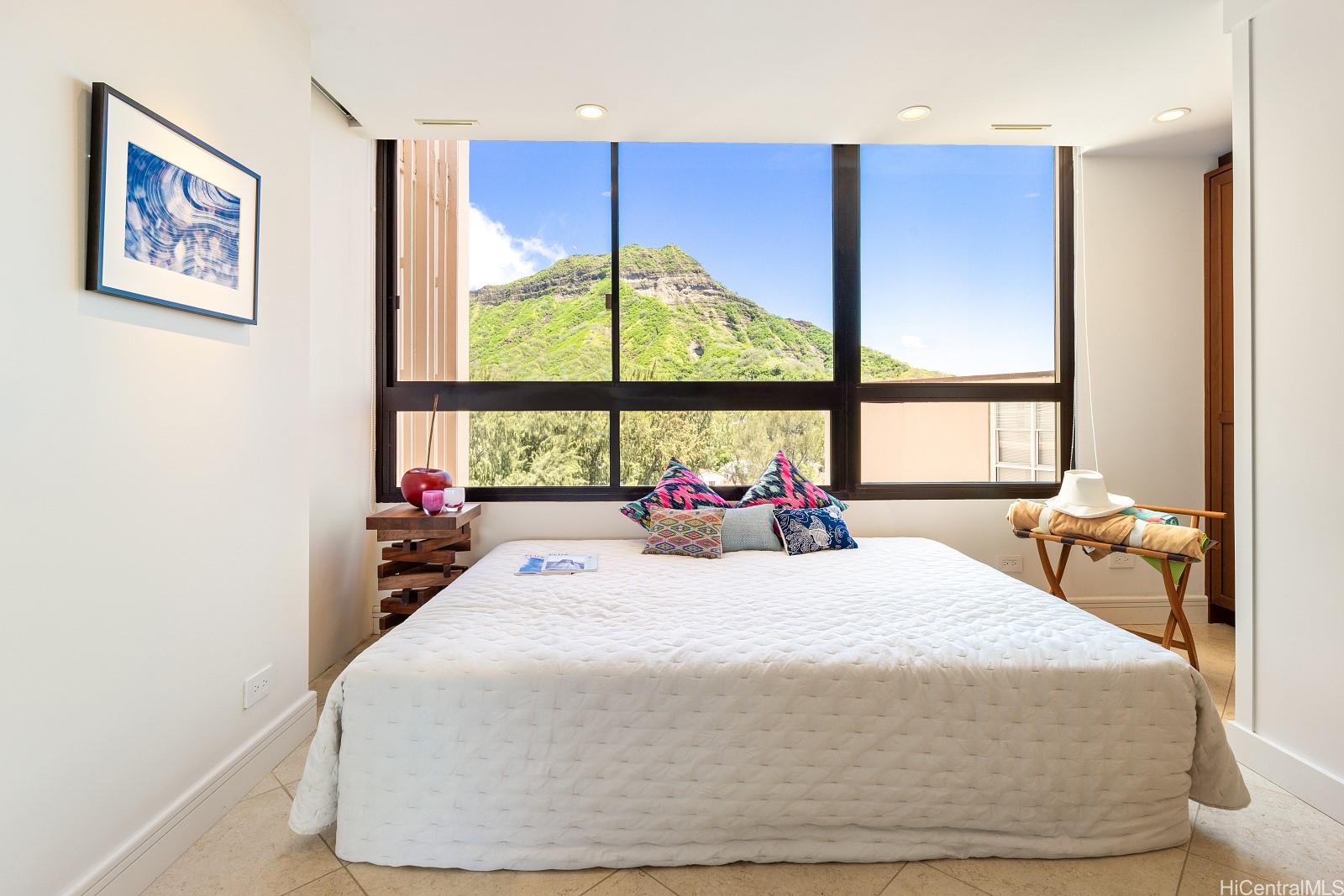 Stunning direct ocean and Diamond Head views welcome you to this spacious 2BR/2BA residence offering 1,446 sq.ft. of interior living. Thoughtfully renovated with quality finishes, the home features a flexible second bedroom with a pocket door—enclose for privacy or open to create an expansive living space. Enjoy a seamless indoor-outdoor ambiance with breathtaking views from both the living area and bedroom.