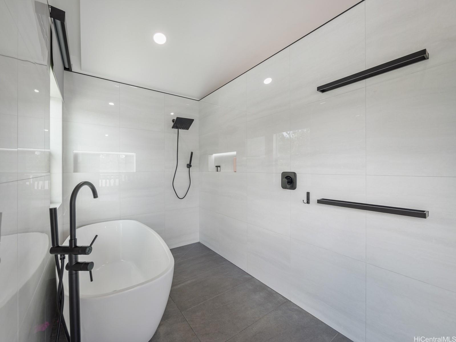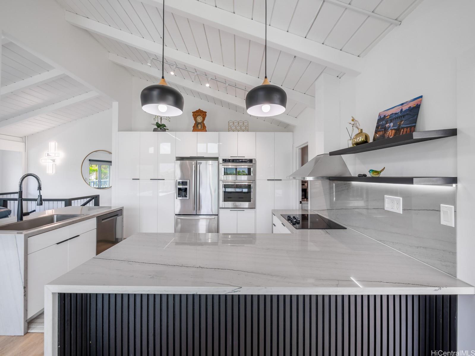 Vaulted ceilings create a bright, open feel in the main living areas, while the fully renovated kitchen features quartz countertops, brand-new appliances, custom cabinetry, and smart lighting. The primary suite opens directly to a wraparound lanai, where panoramic valley views become part of your everyday routine.