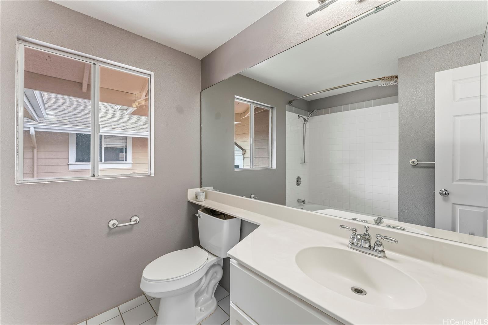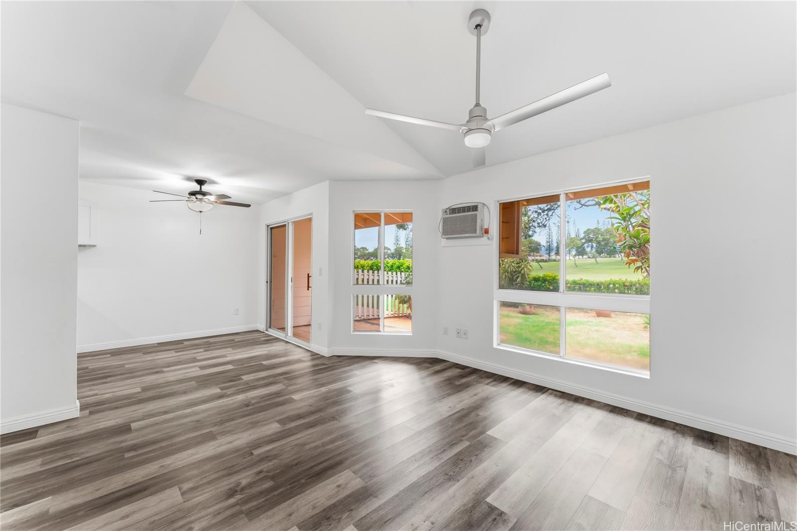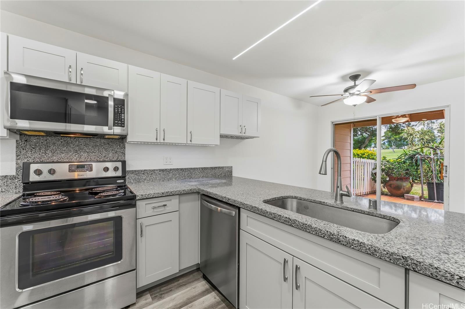 Golf course frontage 3 bedroom, 2.5 bath townhome in Greens at Waikele featuring 4 parking spaces! Recently remodeled kitchen plus vinyl plank flooring on main level. Upstairs primary bedroom has a large walk-in closet, golf course views, and the updated primary bathroom awaits with modern luxuries. Spacious interior layout is bolstered by a large, fenced-in private yard space overlooking Waikele Country Club. Ample storage and full sized washer/dryer are found in the 2 car garage, plus an additional 2 cars may be parked directly outside the garage. This well maintained community with generous guest parking is conveniently located near Waikele Premium Outlets, dining options, freeway access and more.