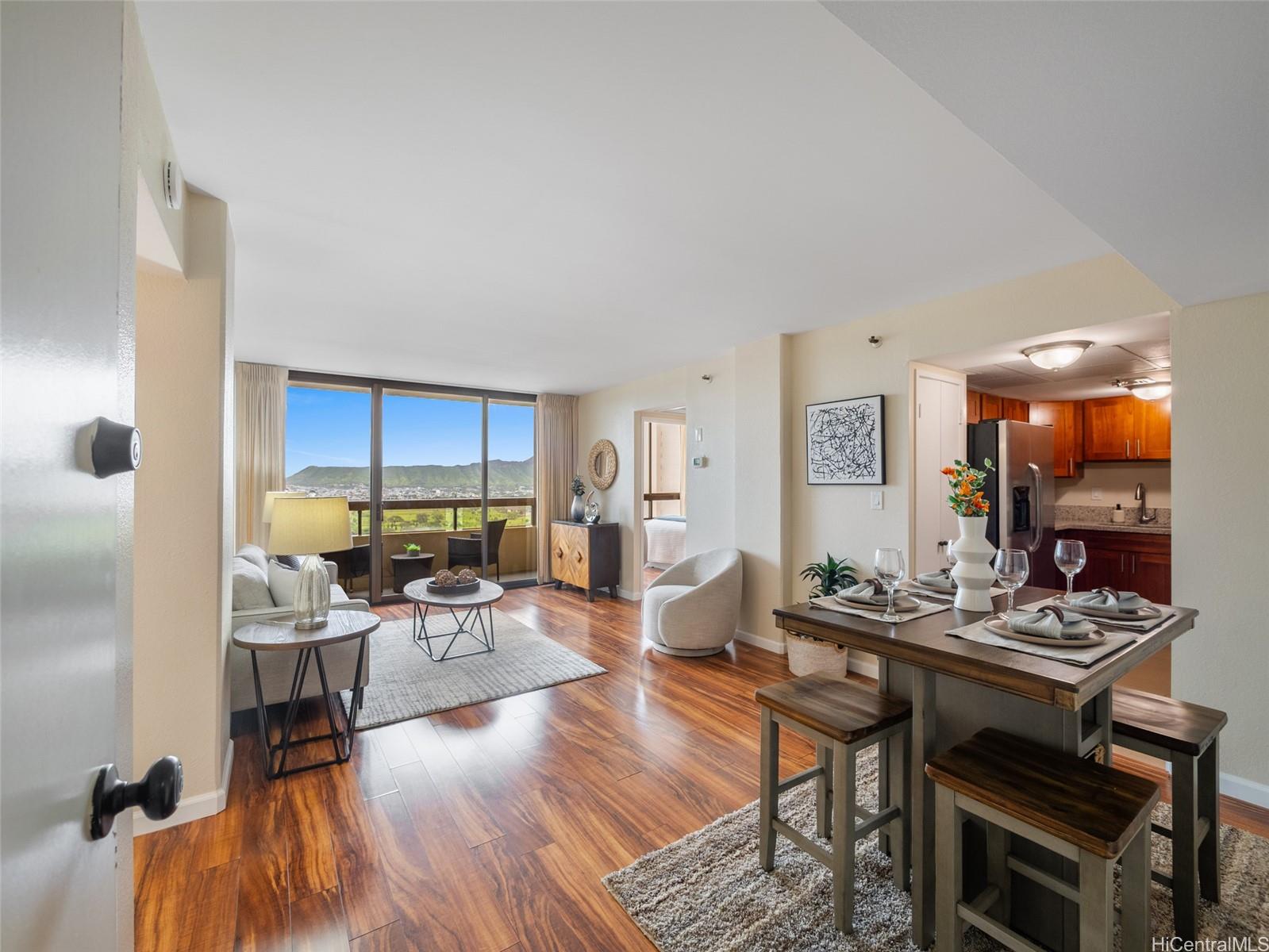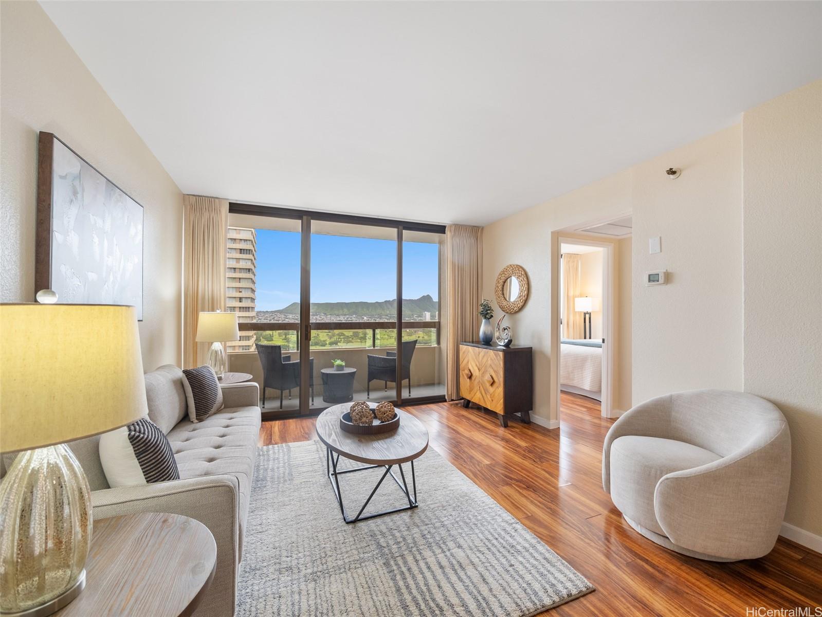 This beautiful 2-bedroom, 2-bathroom unit offers breathtaking views of Diamond Head and the Ala Wai Golf Course from every window. The spacious interior features ample closet space throughout, providing both comfort and convenience. The unit includes a lanai for indoor/outdoor living, washer and dryer, along with one covered parking stall. Residents enjoy resort-style amenities, including a swimming pool, sauna, spa, putting green, tennis courts, pickleball court, BBQ area, recreation room, and car wash facilities. Maintenance fees (HOA) cover electricity, central air conditioning, water, sewer, hot water, basic cable, and internet. Iolani Court Plaza is equipped with a full sprinkler system and fire alarms for added safety, as well as backup battery power to support essential services during outages and emergencies. Don’t miss this opportunity to own this highly desirable unit in Iolani Court Plaza!
