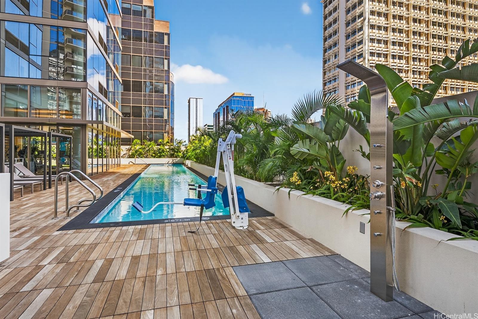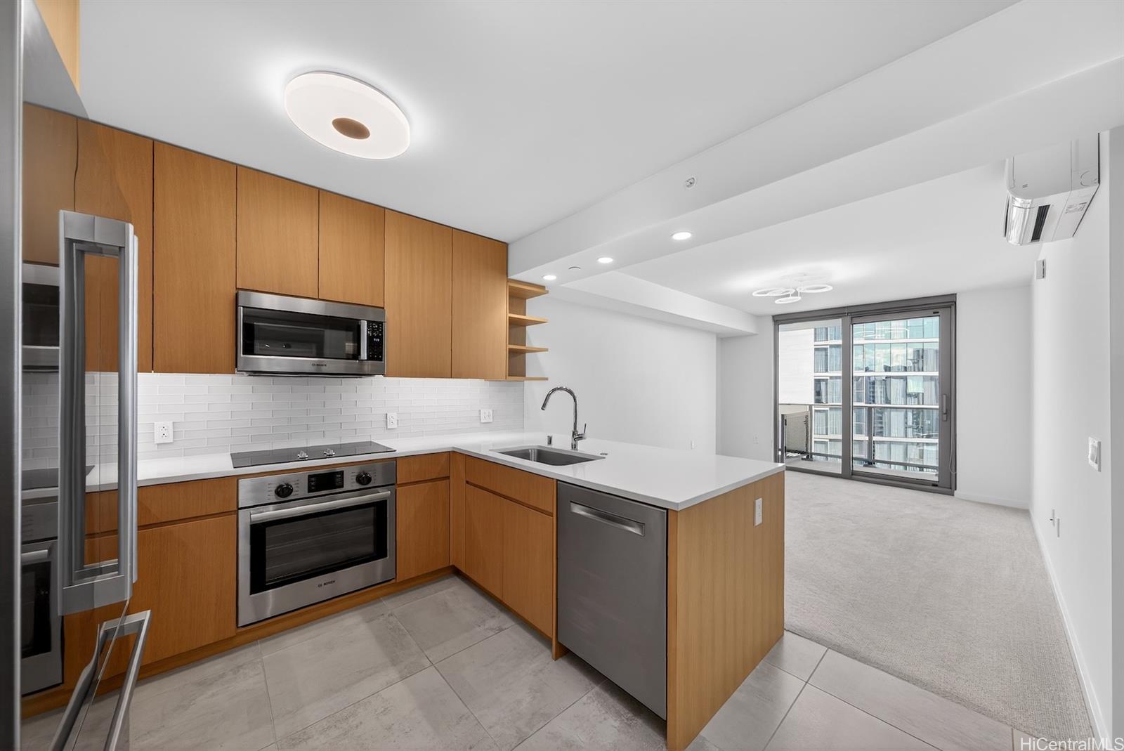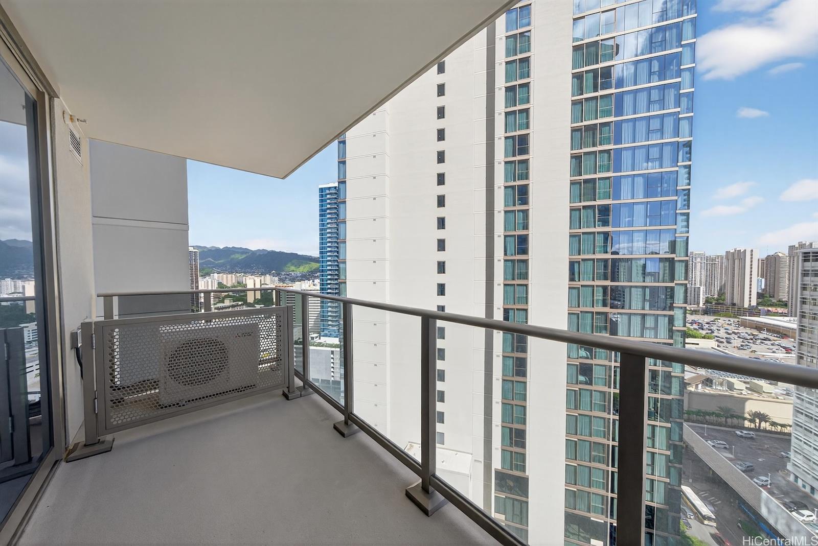 Sky Ala Moana West. Be ready to live on this high floor 1 bedroom, 1 bathroom with fantastic views. Located in the center of Ala Moana area and conveniently located near Ala Moana Shopping Center and Ala Moana Beach Park. Enjoy your luxury amenities in the building which features a pool and whirlpool spa, private dining rooms, playground, cabanas, BBQ area, fitness areas and more! Unit features upgraded stainless steel appliances, and quartz countertops. Covered garage parking stall which includes a convenient storage locker for you on the same floor.