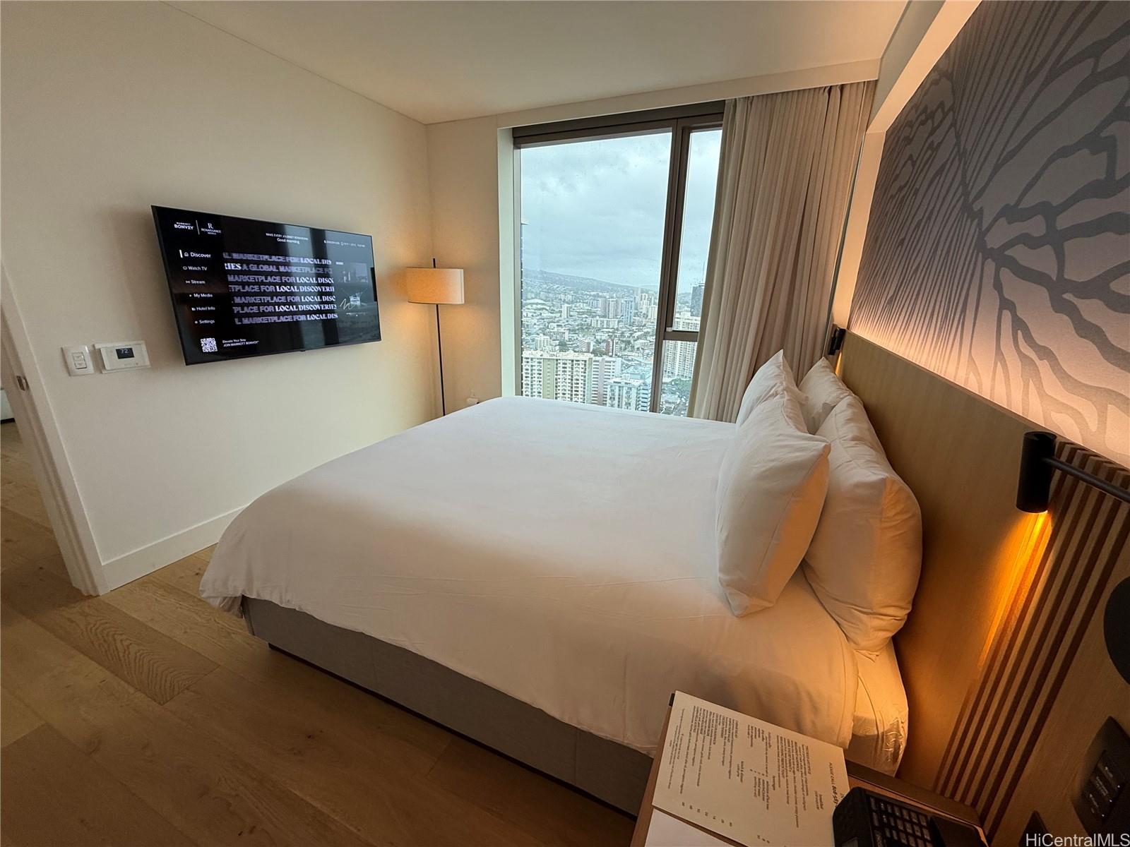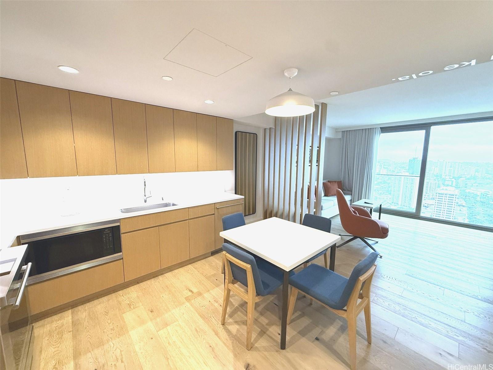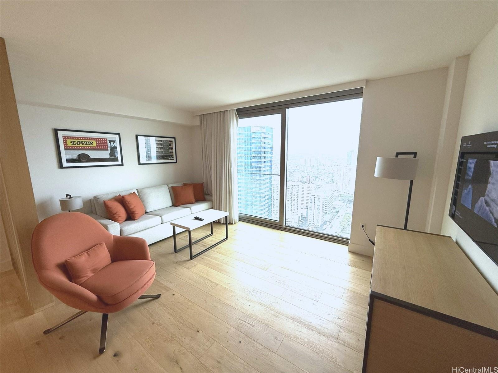 ホノルルの中心部に位置するスカイ・アラモアナ・イーストの高層階にある1ベッドルーム/1バスルームのユニットです。床から天井までの窓からは、街並み、山々、そして一部海を一望でき、自然光がたっぷりと差し込みます。洗練されたデザインのこのユニットは、モダンな内装、現代的な家具、そして効率的な空間利用が特徴です。スカイ・アラモアナは、プール、フィットネスセンター、24時間セキュリティなど、リゾートスタイルのアメニティを備えた比較的新しい開発物件です。アラモアナ・ショッピングセンター、アラモアナ・ビーチパーク、ワイキキ、そして様々なレストランやエンターテイメント施設までわずか数分という便利な立地です。このユニットはホテルレンタルプログラムの一部となっており、好立地で収益性を求める投資家にとって絶好の機会です。家具付きで、すぐにでも入居可能です。