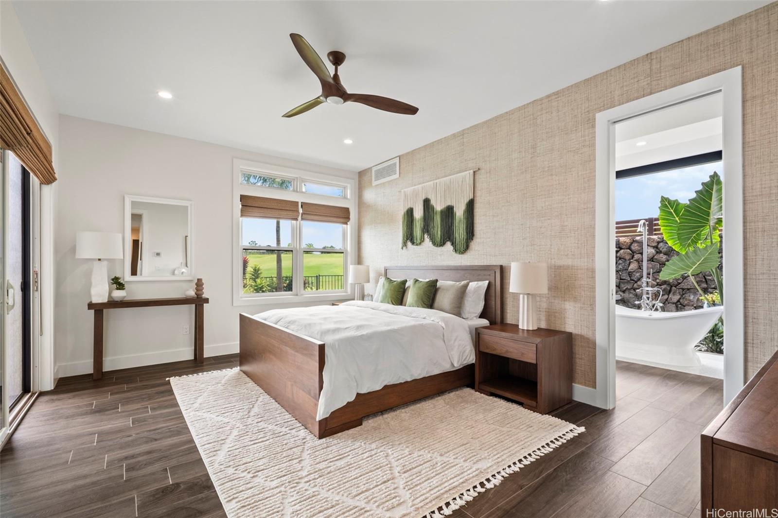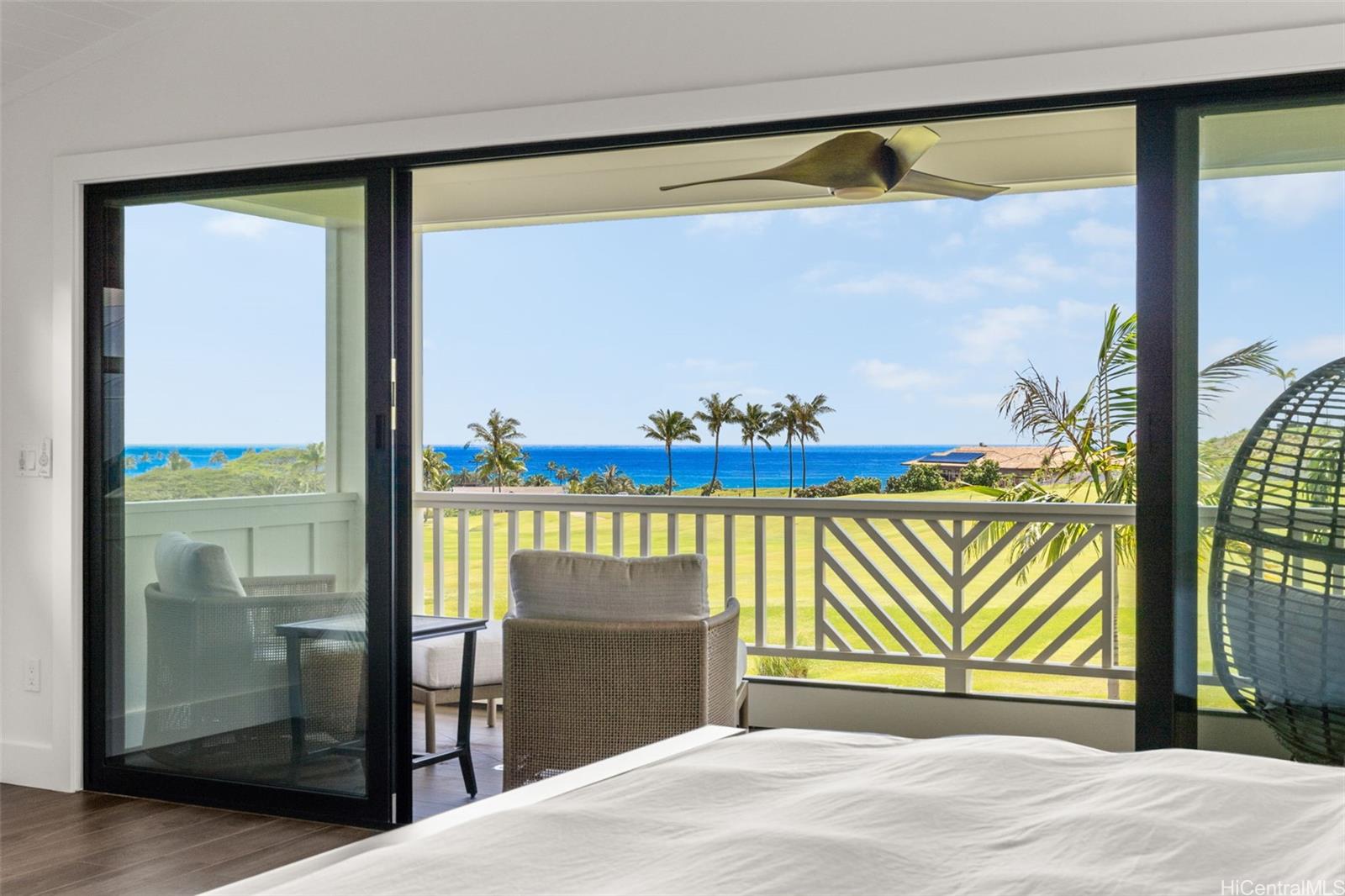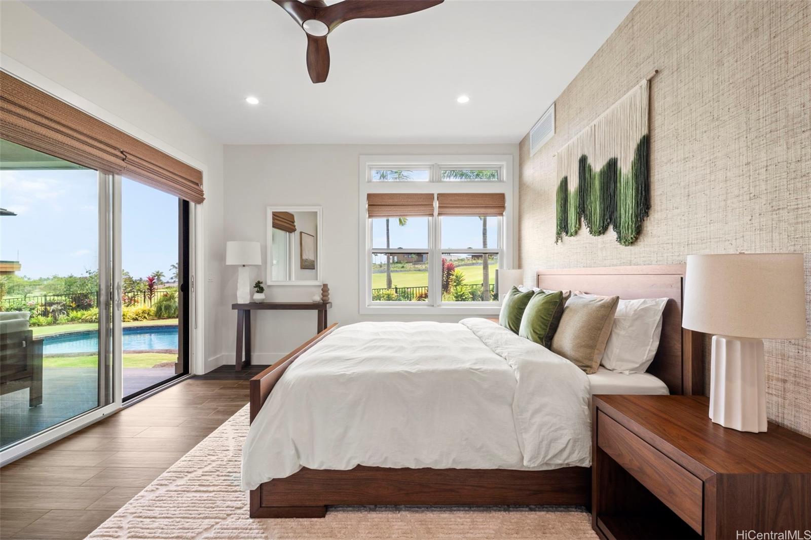 Located on a private cul-du-sac in the Kaimalino neighborhood of Kukuiula, this rare 5 bedroom and 4.5 bath residence is perfect for your tropical family retreat, or as a lucrative investment rental property. One of the few properties available with both ocean and golf course views, the property is located on the 9th hole of the Tom Weiskopf designed championship golf course. The home is thoughtfully positioned to both frame sweeping ocean views from nearly every room in the home and capture the natural trade winds of Kauai. The outdoor space features lush tropical landscaping with a private fenced-in back yard for privacy and enjoyment. The open-concept living area flows seamlessly to the outdoor lanai through Fleetwood retractable doors, providing effortless indoor/outdoor living. A refined interior designed for both elevated living and effortless entertaining, this property showcases a seamless blend of sophistication and functionality. The home is uniquely distinguished by two primary suites, each serving as its own tranquil retreat. Both suites are. All comments, data is provided by seller or seller's representatives.