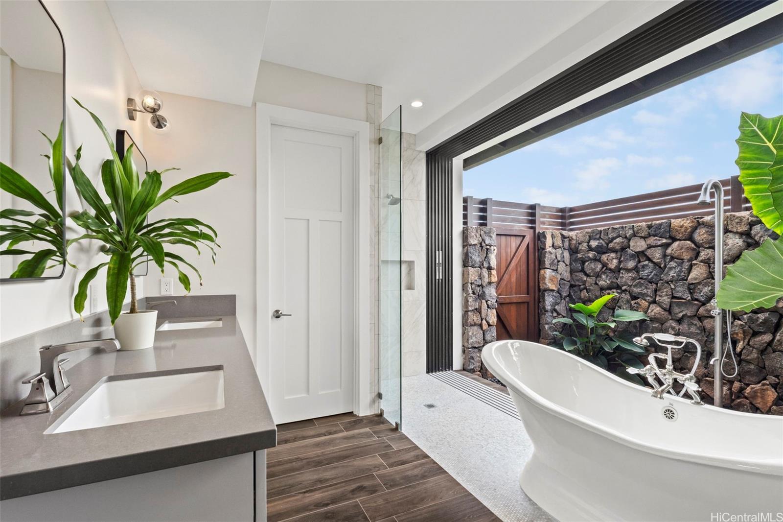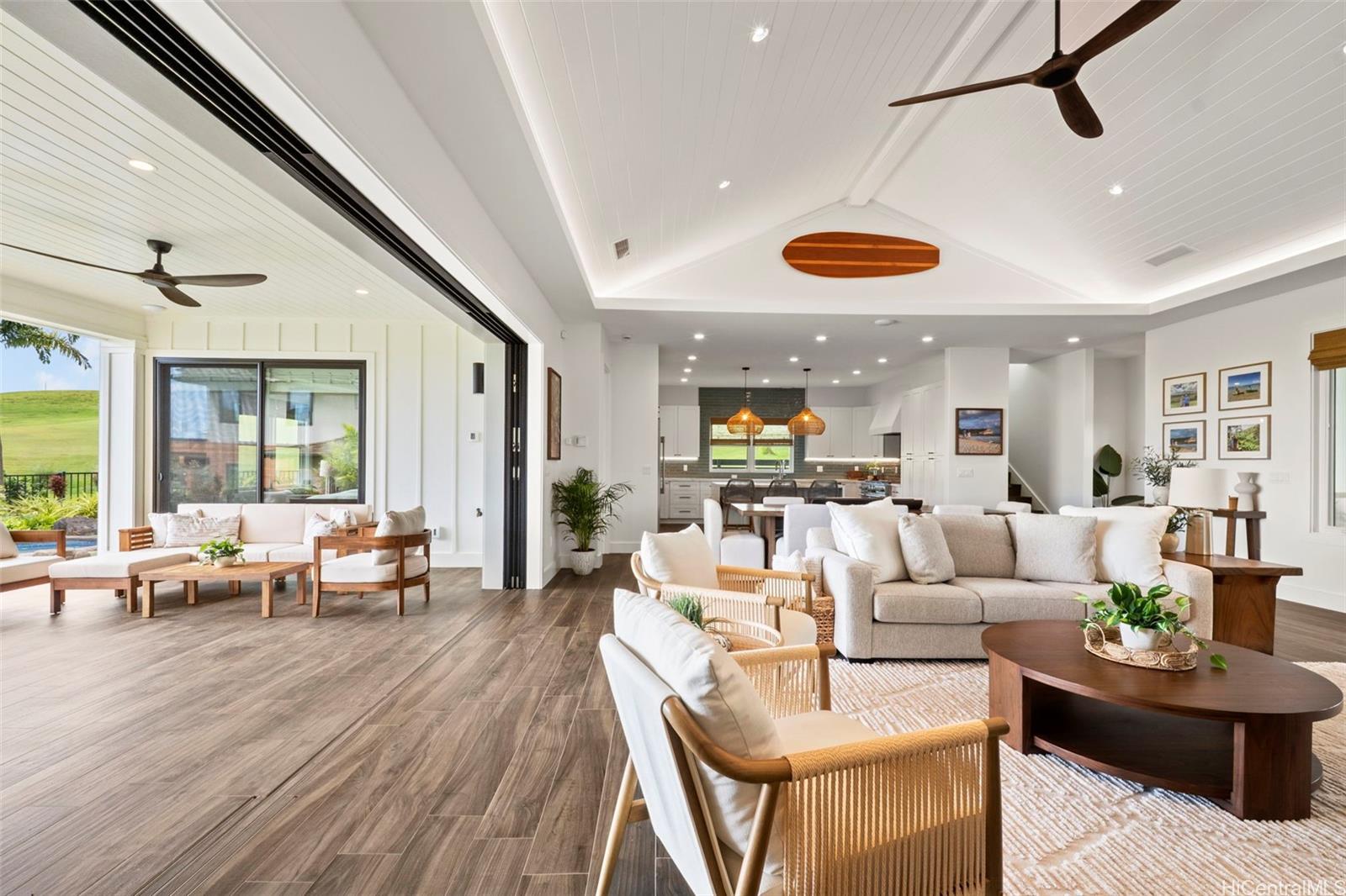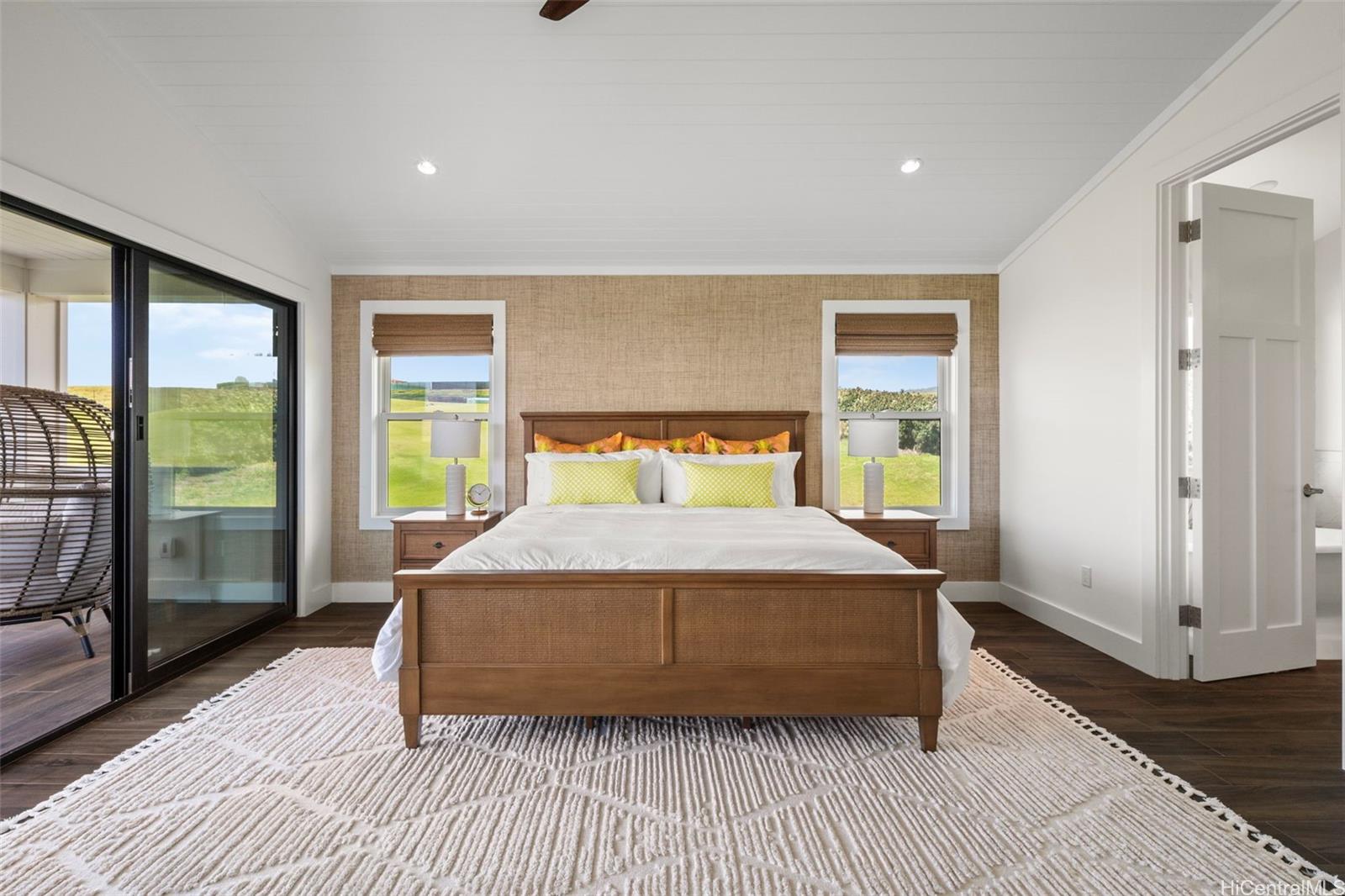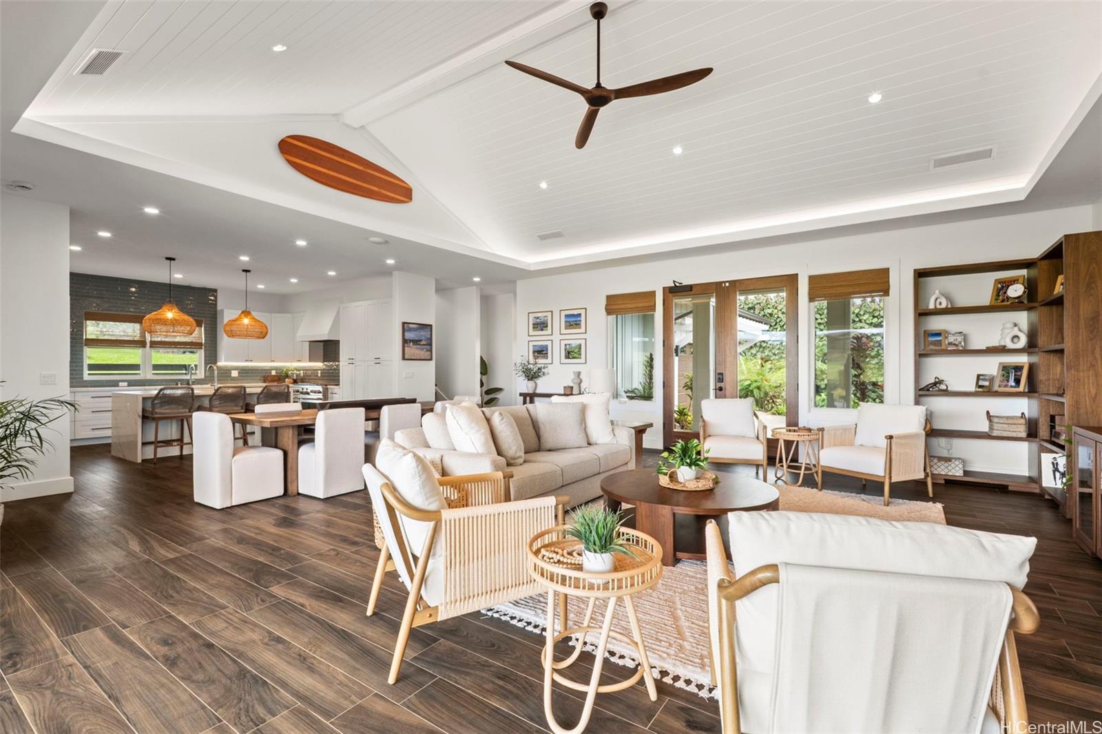 Located on a private cul-du-sac in the Kaimalino neighborhood of Kukuiula, this rare 5 bedroom and 4.5 bath residence is perfect for your tropical family retreat, or as a lucrative investment rental property. One of the few properties available with both ocean and golf course views, the property is located on the 9th hole of the Tom Weiskopf designed championship golf course. The home is thoughtfully positioned to both frame sweeping ocean views from nearly every room in the home and capture the natural trade winds of Kauai. The outdoor space features lush tropical landscaping with a private fenced-in back yard for privacy and enjoyment. The open-concept living area flows seamlessly to the outdoor lanai through Fleetwood retractable doors, providing effortless indoor/outdoor living. A refined interior designed for both elevated living and effortless entertaining, this property showcases a seamless blend of sophistication and functionality. The home is uniquely distinguished by two primary suites, each serving as its own tranquil retreat. Both suites are. All comments, data is provided by seller or seller's representatives.