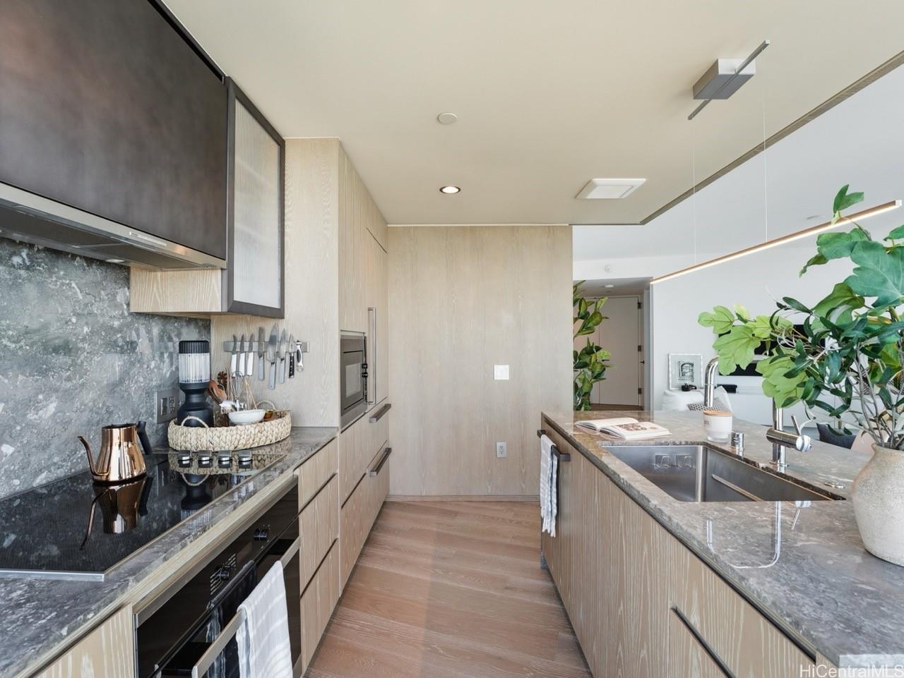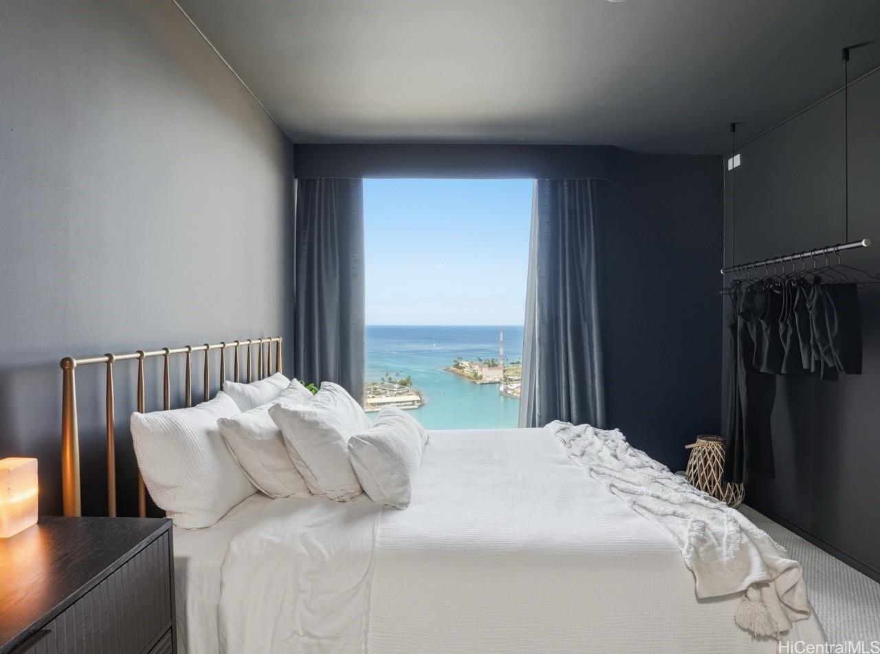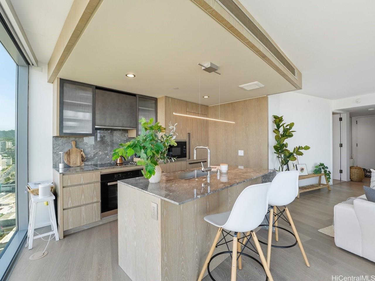 The highly coveted "01" corner unit at Ko'ula - featuring breathtaking views of the ocean & horizon, sunsets, Kewalo Boat Harbor, and the newly renovated Victoria Ward Park. This well laid out 1-bedroom has a spacious living room flow to your dining/kitchen area, and provides actual outdoor living space with a deep and usable lanai with privacy walls on either side. Upgrades include modern fixtures, a repainted interior for a bright and airy feel, electronic blinds, drapes, and full black-out curtains in your bedroom for undisturbed rest. This unit is fully furnished with higher-end furniture, each piece carefully chosen for this home. Our parking stall is not the tighter compact stall that most units have...something to be mentioned. Ko'ula is most conveniently located just above a large green park/playground, the newest stores, restaurants, coffee shops, and gyms in all of Ward Village.