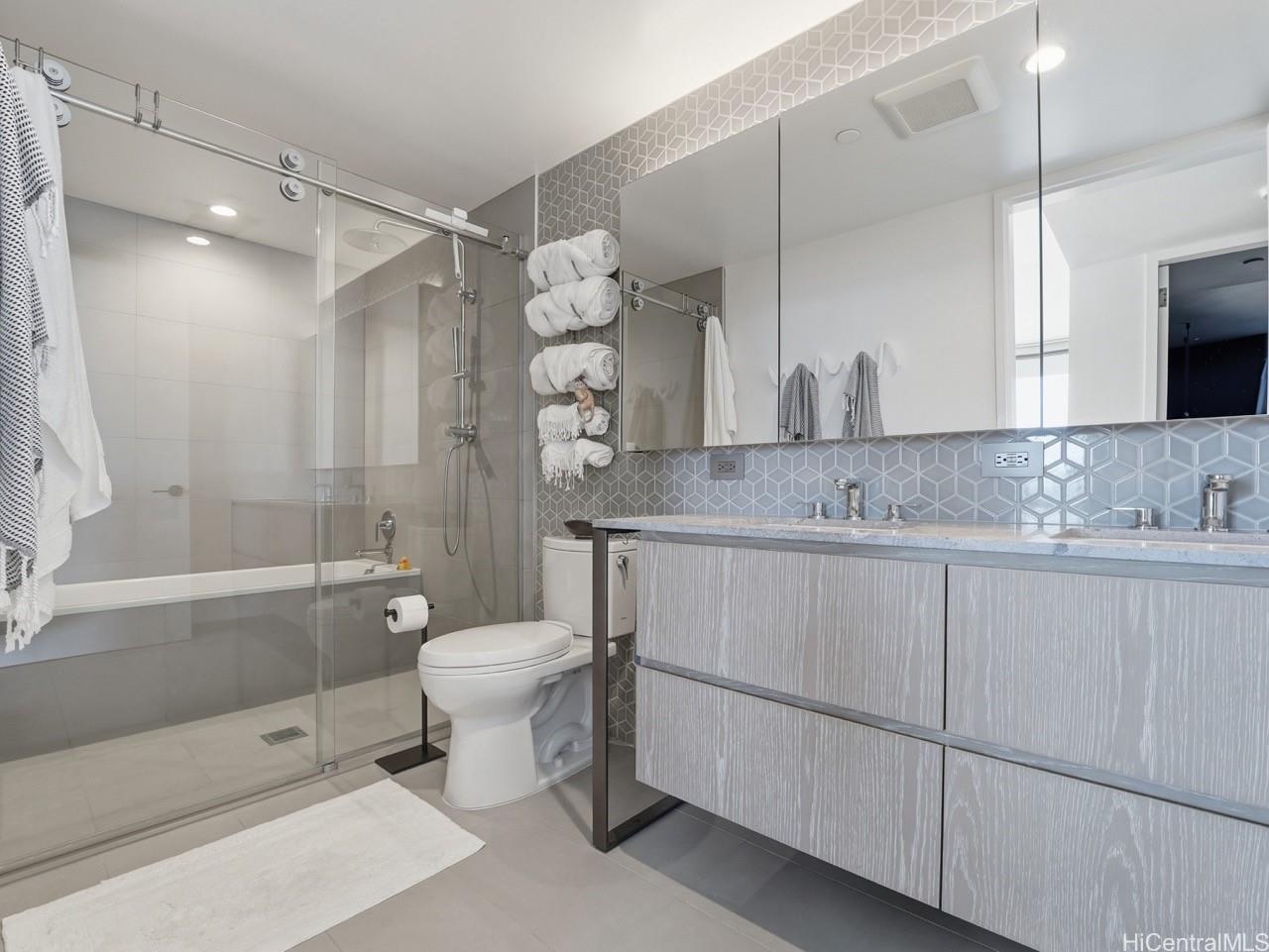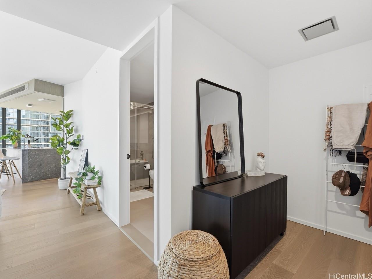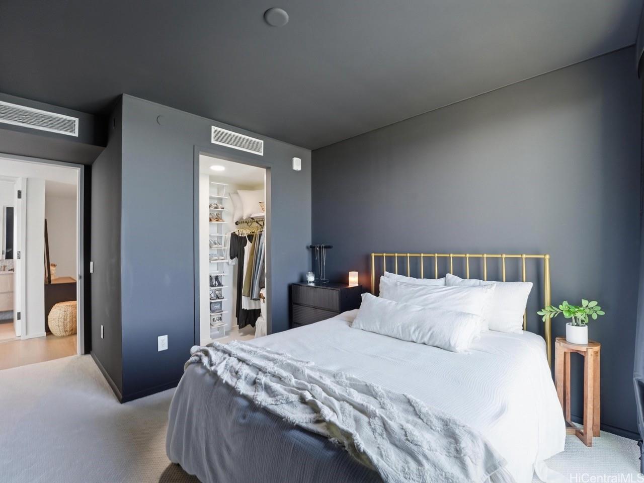 The highly coveted "01" corner unit at Ko'ula - featuring breathtaking views of the ocean & horizon, sunsets, Kewalo Boat Harbor, and the newly renovated Victoria Ward Park. This well laid out 1-bedroom has a spacious living room flow to your dining/kitchen area, and provides actual outdoor living space with a deep and usable lanai with privacy walls on either side. Upgrades include modern fixtures, a repainted interior for a bright and airy feel, electronic blinds, drapes, and full black-out curtains in your bedroom for undisturbed rest. This unit is fully furnished with higher-end furniture, each piece carefully chosen for this home. Our parking stall is not the tighter compact stall that most units have...something to be mentioned. Ko'ula is most conveniently located just above a large green park/playground, the newest stores, restaurants, coffee shops, and gyms in all of Ward Village.
