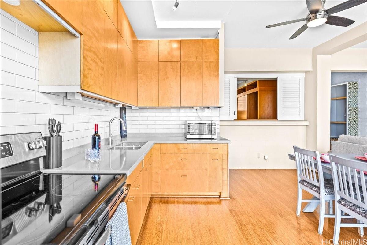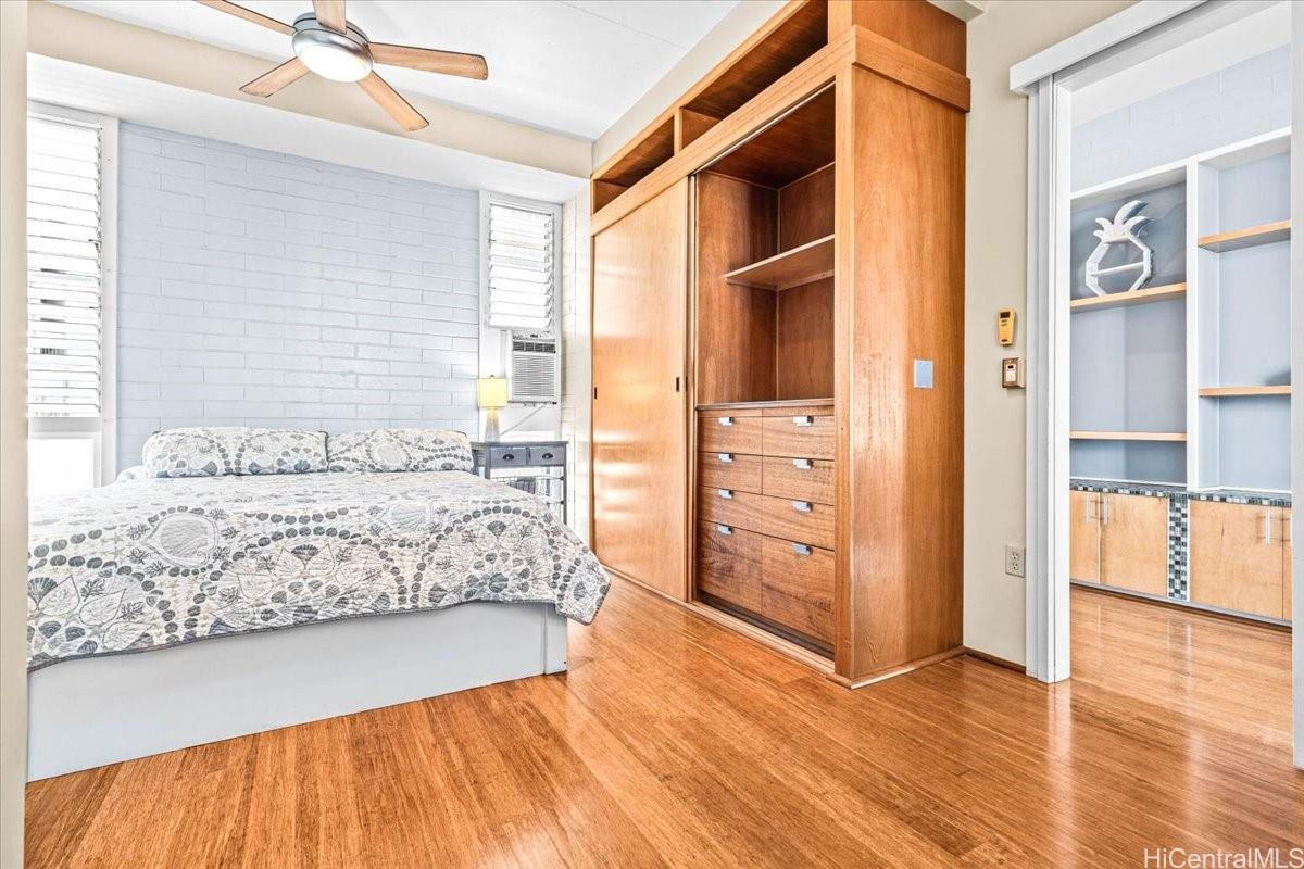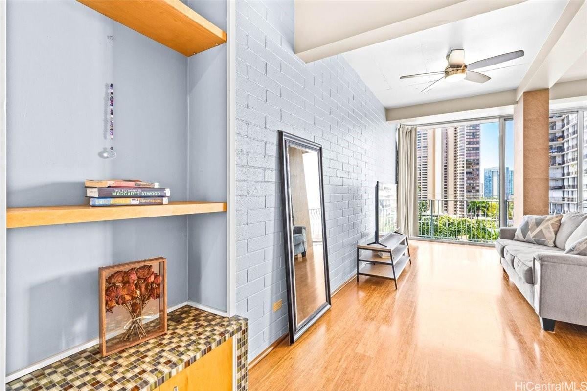 Perched on the penthouse level, this 1-bedroom loft-style condo captures a full panoramic Honolulu skyline showcasing sunset views and a peak of the ocean, with large floor-to-ceiling windows that bring in ample natural lighting. Renovated high ceilings with industrial finishes that opens the space and creates a bright, spacious and airy living experience. Wake up to the view right from your bedroom, complete with a large custom closet featuring built-in drawers for additional storage. The kitchen boasts wood cabinetry preserving the vintage character complemented by new quartz countertops and a modern backsplash. Exposed brick accent walls add an industrial, stylish element. Thoughtfully updated with new bamboo flooring, new ceiling fans and light fixtures, a resurfaced shower, and electrical improvements. The bathroom leans into its original charm with a stylish retro aesthetic featuring eye-catching blue tile that adds personality. Includes 1 - assigned covered parking. Pet-friendly building with amenities such as a saltwater pool, community laundry, bike racks, trash chute, elevator, and on-site manager. Just minutes to UH, Blaisdell Center, downtown, Waikiki, and hospitals.