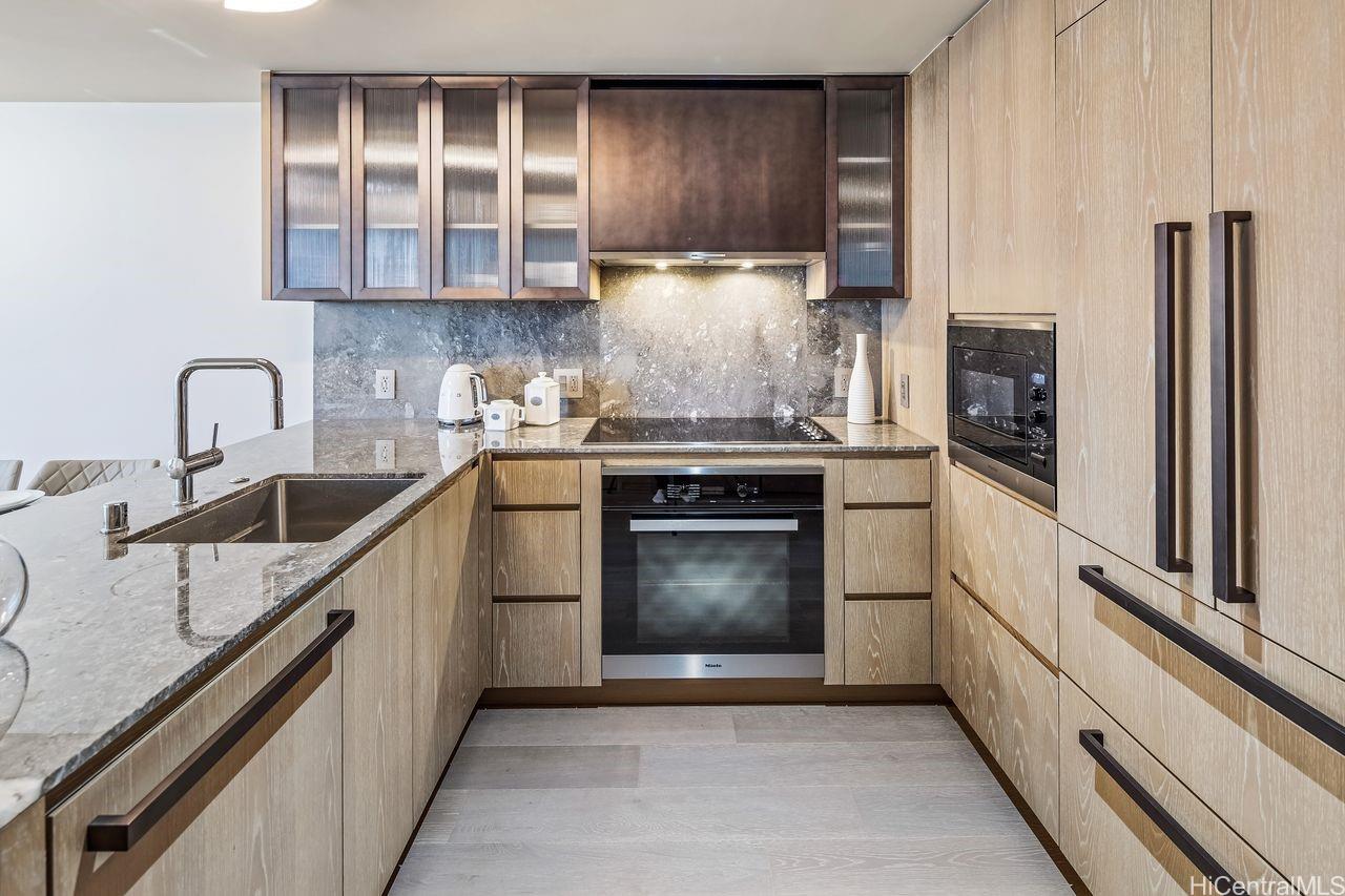New contemporary two bedroom in outstanding price! Prime location in center of Ward Village, Ala Moana beach, Whole Food, Ala Moana mall and restaurants! This gorgeous unit features a tasteful interior that's highlighted with ocean and mountain views from you own private lanai with easy access to a Ward village park below. Additionally, It’s highly upgraded with designer motorized blinds, upgraded new lighting, beautifully appointed Miele appliances, Samsung HDTV with a Bose sound system set up, spacious bathrooms, central air-conditioning and very generous closet space. The primary bathroom has a freestanding tub with a separate shower enclosure and a private glass door for the toilet area. What also makes this particular unit desirable is the weather protected parking location with 2 roomy side by side stalls! Outstanding amenities include: the Private and grand party Room, Sauna and treatment Room, Pool Side Cabanas, two Jacuzzis, BBQ Pavilions, and a world class Fitness Gym