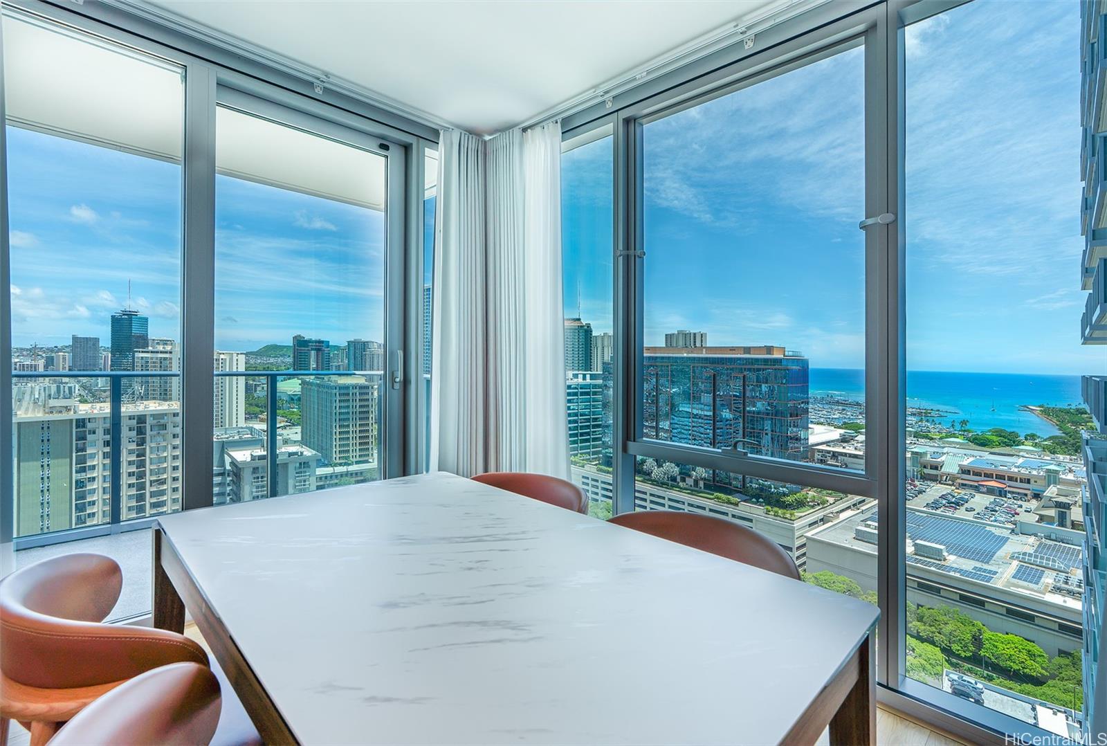 features stunning views of the ocean, mountains, and city. Enjoy the sunrise right from your own home. The kitchen provides a clean and functional space for everyday living. Two side-by-side parking stalls and a private storage locker add convenience and extra space. At Azure, resort-style amenities elevate daily living with a pool, BBQ, fitness center, movie theater, dog park, and an elegant lounge for relaxing or entertaining. Located just minutes from Ala Moana Shopping Center, restaurants, and beaches.